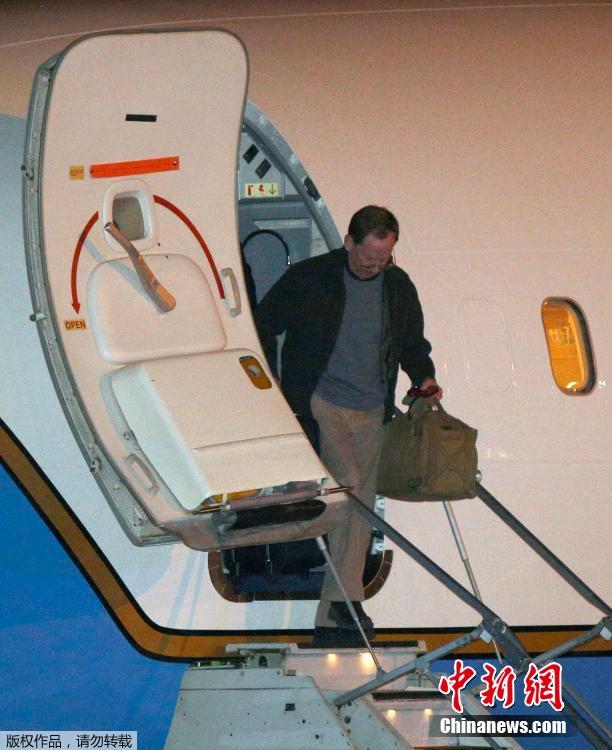 当地时间2014年10月22日,美国俄亥俄州达顿,被朝鲜扣押后释放的美国人杰弗里-福尔(Jeffrey Fowle),乘飞机回到美国,降落在俄亥俄州赖特-帕特森空军基地。