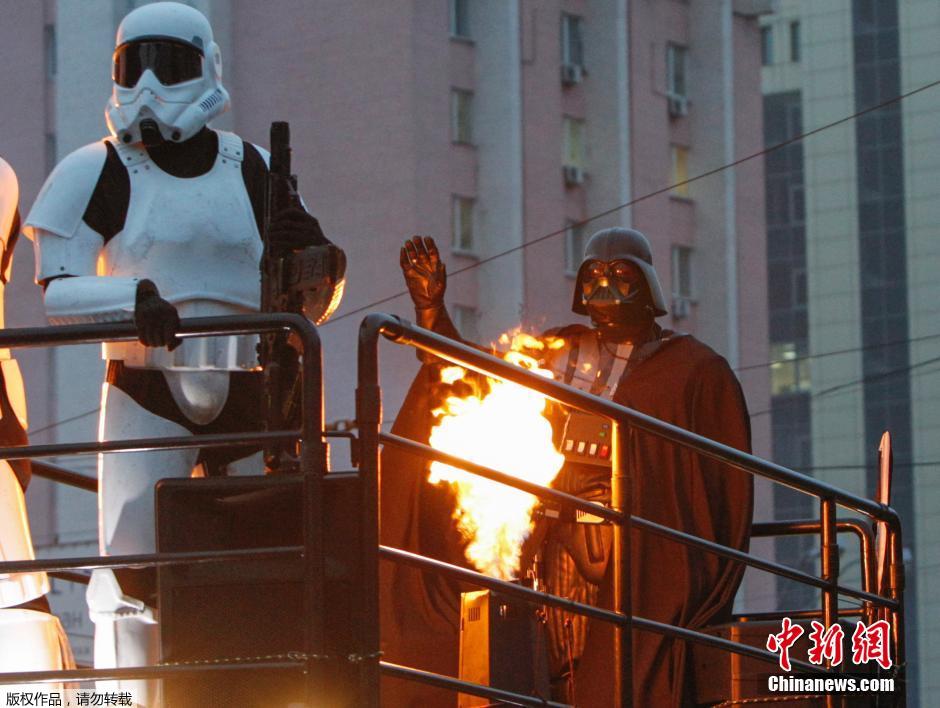 当地时间10月22日,乌克兰基辅街头,乌克兰网络党候选人扮成《星球大战》中的黑武士游街,黑暗系造型为自己造势拉选票。黑武士将参加于本月26日举行的议会选举,以推行电子政府并增加财政的透明度。