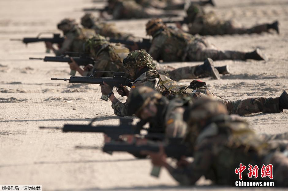 当地时间2014年10月21日,西班牙阿尔梅利亚,西班牙海军陆战队参与在当地附近的加鲁查海滩进行的军事演习。北约国家的23艘战舰正在地中海和大西洋进行演习,该演习是北约快速反应部队危机处理能力训练的一部分。共有超过5千名军事人员和来自14个北约成员国以及2个北约伙伴国的海军士兵参与了演习,演习测试了该部队对任意北约盟国发生紧急事件后快速反应的准备充分程度。