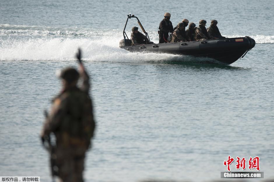 当地时间2014年10月21日,西班牙阿尔梅利亚,西班牙海军陆战队参与在当地附近的加鲁查海滩进行的军事演习。北约国家的23艘战舰正在地中海和大西洋进行演习,该演习是北约快速反应部队危机处理能力训练的一部分。共有超过5千名军事人员和来自14个北约成员国以及2个北约伙伴国的海军士兵参与了演习,演习测试了该部队对任意北约盟国发生紧急事件后快速反应的准备充分程度。