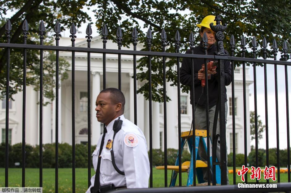 当地时间10月23日,美国白宫外围安保措施严密,防护栏在原有基础上多增加了一层,以防止再次发生翻墙事件。