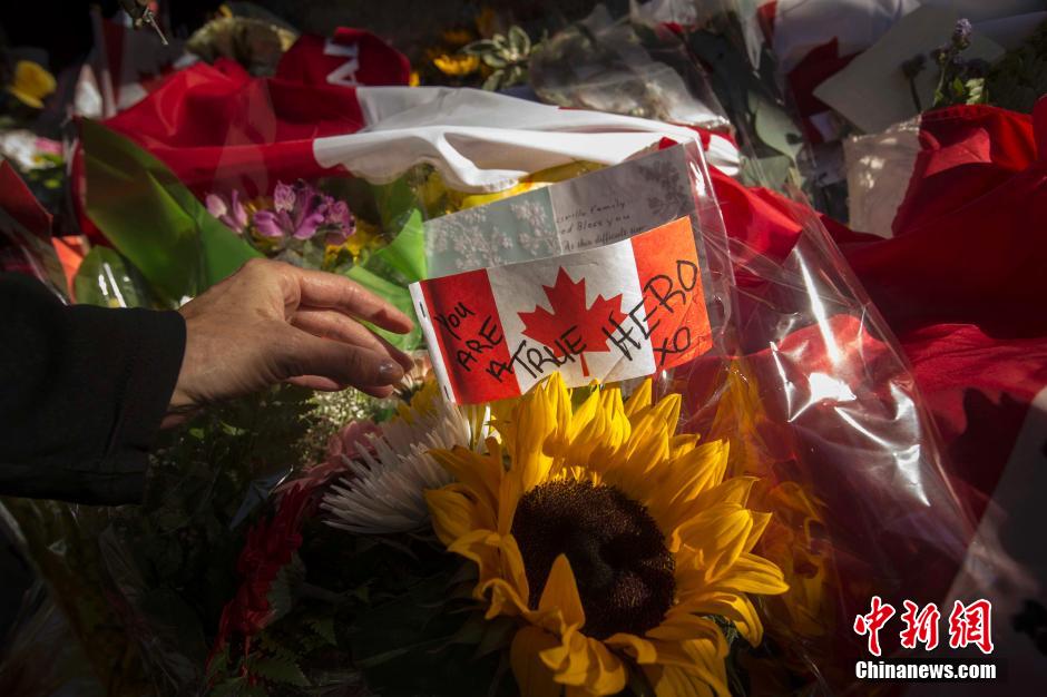 当地时间2014年10月23日,加拿大民众献花悼念枪击案枪遇难士兵Nathan Cirillo。10月22日,加拿大议会大楼、国家战争纪念馆和市中心的一家购物中心发生枪击事件。加拿大警方确认,一名在国家战争纪念馆值勤的加拿大士兵遭枪击后不治身亡,另有一名卫兵受伤,一名枪手被警方击毙。
