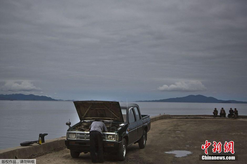当地时间10月23日,一个男人在海岸边修理他的汽车。