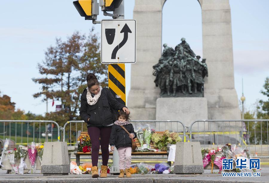 10月23日,在加拿大首都渥太华,人们来到国家战争纪念碑前悼念遇袭身亡的士兵。当日,众多人士来到位于加拿大首都渥太华的国家战争纪念碑前,悼念前一天在这里遇袭身亡的执勤士兵内森·西里洛。 新华社发(邹峥摄)