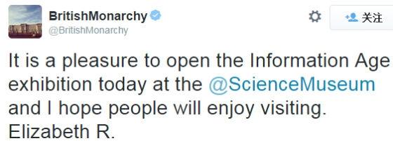 据英国《每日电讯报》10月24日消息,英国女王伊丽莎白二世今天参观了伦敦科学博物馆,并在数百观众的见证下发布了自己的第一条微博:很高兴能为博物馆今天的“信息时代”展览揭幕,希望大家尽情参观。图片来源:环球网