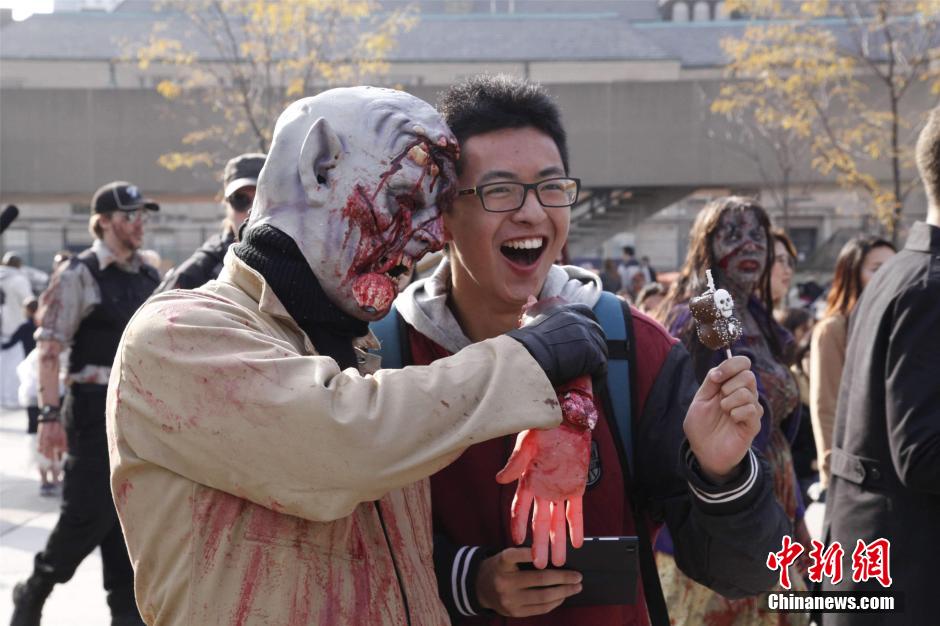 当地时间10月25日,临近万圣节,多伦多市中心的央街和多伦多市政广场上,大量“僵尸”出没,“吓坏”路人。不过,有人担惊受怕,也有人乐在其中。 中新社发 林赛 摄
