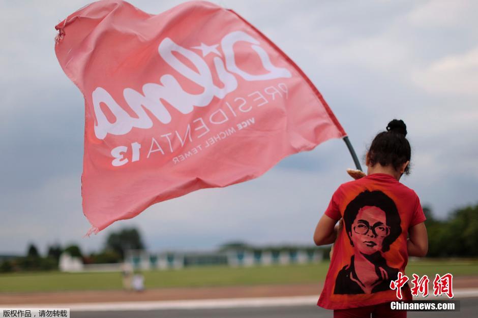 当地时间10月26日,在巴西巴西利亚,劳工党候选人、现总统迪尔玛·罗塞夫的支持者庆祝胜利。