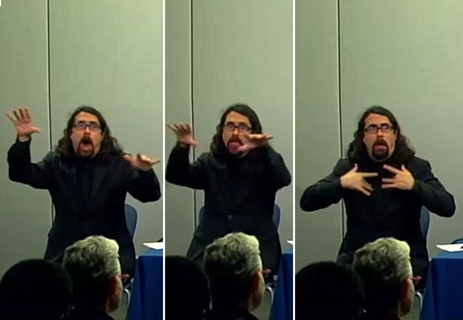 据英国《每日邮报》10月26日报道,美国纽约上周确诊首例感染埃博拉患者,市长白思豪联同卫生官员召开记者会,但观众焦点却不在埃博拉个案上,而是坐在白思豪旁边的手语传译员。这名手语传译员表情丰富、动作夸张,为沉闷的记者会添加不少笑料,一夜间成为大批网民追捧的对象。(网页截图)