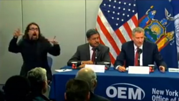 据英国《每日邮报》10月26日报道,美国纽约上周确诊首例感染埃博拉患者,市长白思豪联同卫生官员召开记者会,但观众焦点却不在埃博拉个案上,而是坐在白思豪旁边的手语传译员。这名手语传译员表情丰富、动作夸张,为沉闷的记者会添加不少笑料,一夜间成为大批网民追捧的对象。(网页截图)