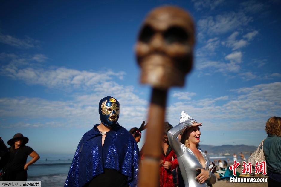 当地时间2014年10月25日,美国冲浪爱好者在加州海滩举行万圣节冲浪比赛,选手奇葩造型吸引眼球。