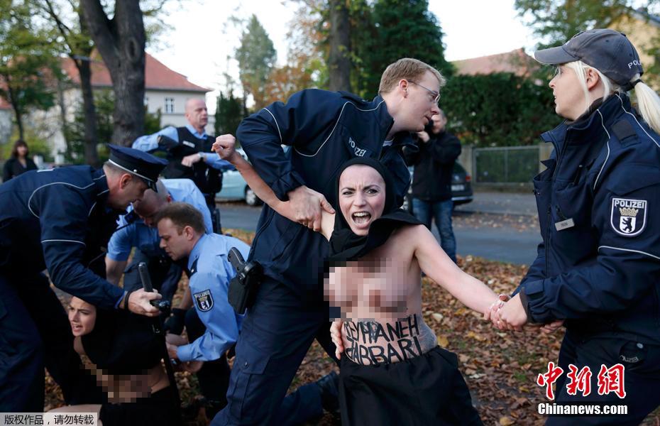 当地时间2014年10月27日,德国柏林,女权组织Femen的成员在伊朗驻柏林使馆前半裸示威,抗议伊朗女子Reyhaneh Jabbari因反抗性侵自卫杀人而被处以绞刑。