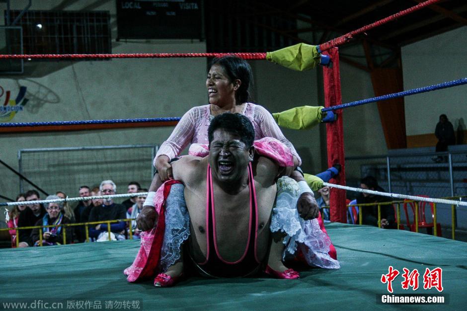 当地时间2014年10月26日,玻利维亚埃尔阿尔托,摔跤是玻利维亚十分受欢迎的一项运动,而女摔跤选手则被称为cholitas。每个星期日,在这个海拔4070米的摔跤场上都会举行比赛,女摔跤手可以跟男摔跤手同场竞技,不过她们必须身着传统长裙,穿着不可暴露。这种比赛大部分是表演性质的,主要是让观众体会到那种气氛,而不是真正的竞技。不过有些女子超猛,经常打的男选手也招架不住。