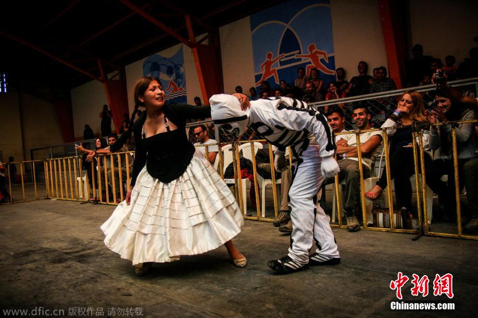 当地时间2014年10月26日,玻利维亚埃尔阿尔托,摔跤是玻利维亚十分受欢迎的一项运动,而女摔跤选手则被称为cholitas。每个星期日,在这个海拔4070米的摔跤场上都会举行比赛,女摔跤手可以跟男摔跤手同场竞技,不过她们必须身着传统长裙,穿着不可暴露。这种比赛大部分是表演性质的,主要是让观众体会到那种气氛,而不是真正的竞技。不过有些女子超猛,经常打的男选手也招架不住。