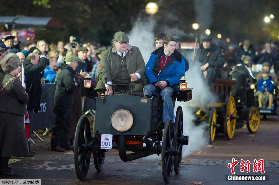 当地时间2014年11月2日,英国伦敦,大量1905年生产的老爷车齐聚伦敦,参加英国举行的老爷车巡游。