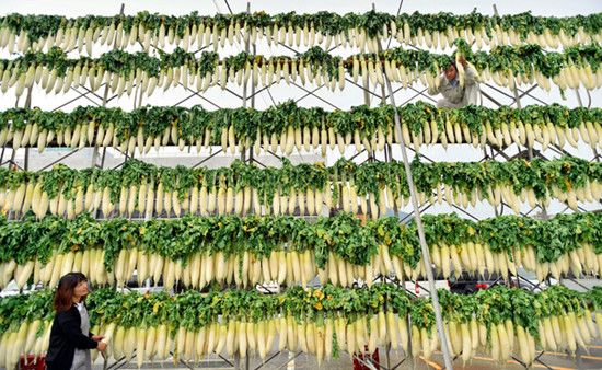 农耕生活中心生活中心工作人员表示,“这些萝卜将在寒风中被吹上两周,被吹后萝卜将更甜,这种腌渍方法以及持续了30多年。”