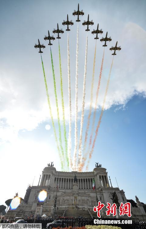 当地时间2014年11月4日,意大利罗马,威尼斯广场上,意大利空军参加建军节飞行表演的飞机喷出意大利国旗红、白、绿三种颜色的尾烟。当日,意大利首都罗马飞行表演,庆祝建军节,这一天同时也是一战结束纪念日。