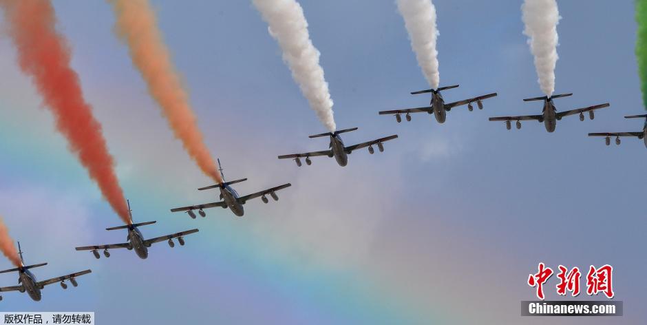 当地时间2014年11月4日,意大利罗马,威尼斯广场上,意大利空军参加建军节飞行表演的飞机喷出意大利国旗红、白、绿三种颜色的尾烟。当日,意大利首都罗马飞行表演,庆祝建军节,这一天同时也是一战结束纪念日。