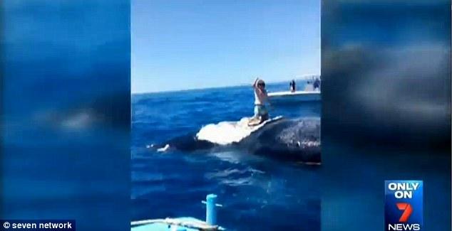 据《每日邮报》2014年11月2日报道,一极限运动爱好者跳上鲸鱼的尸体上后,却意识到周围都是正在啃食鲸鱼的虎鲨。男子发出求救。(网页截图)
