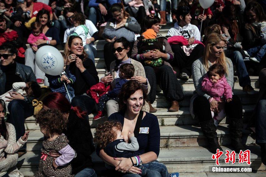 当地时间2014年11月2日,希腊雅典,母亲们参加大规模母乳喂养活动,庆祝世界母乳喂养周。希腊50个城市的母亲们同时参与活动。