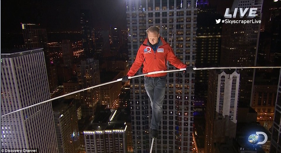 据英国《每日邮报》11月2日报道,号称“不拍死的尼克华伦”在芝加哥开始了新一轮的挑战,在152.4米的高空穿行两座摩天大楼之间。(网页截图)
