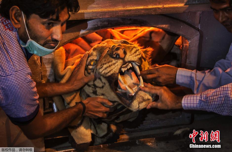 当地时间2014年11月2日,印度新德里,印度环境部门人员在国家动物园销毁非法野生动物制品,抵制动物制品非法贸易。