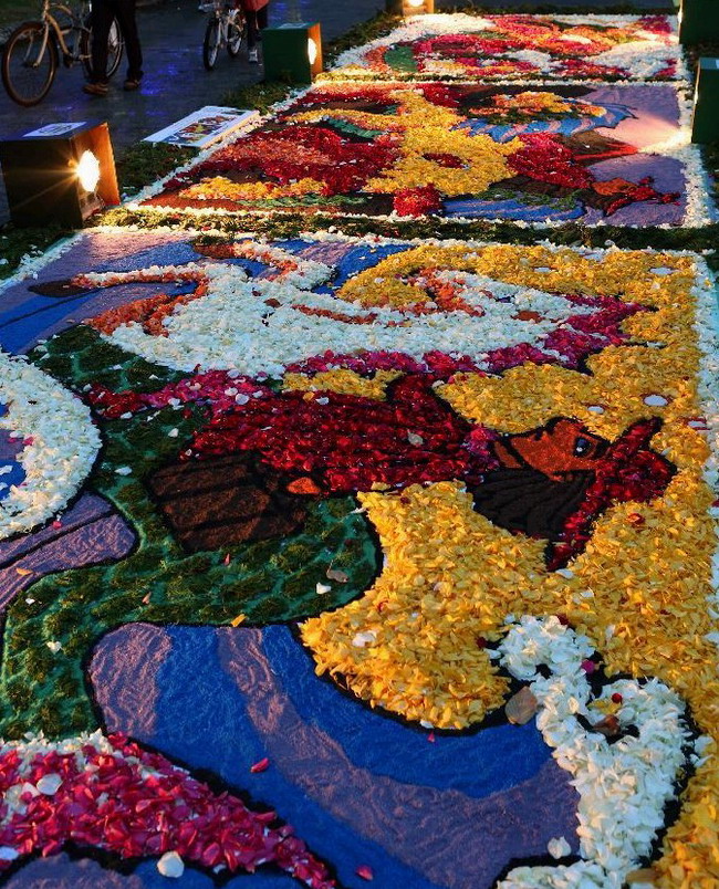 据日本《产经新闻》11月3日报道,日本第14届晴海鲜花节于2日在东京开幕,由6.5万朵玫瑰花的花瓣和彩色细沙制成的“花毯”绘出了绝美夜景。 据悉,此次展出的共有17幅“花毯”作品,由东京艺术大学的教师和学生设计图样,当地中小学生约300人动手铺制。 图片来源:国际在线