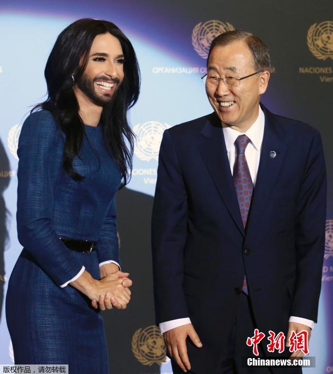 当地时间2014年11月3日,奥地利维也纳,联合国秘书长潘基文在联合国总部就同性恋者的权利和对同性恋者的宽容发表讲话,奥地利变装歌手肯奇塔·沃斯特献唱并与潘基文握手。
