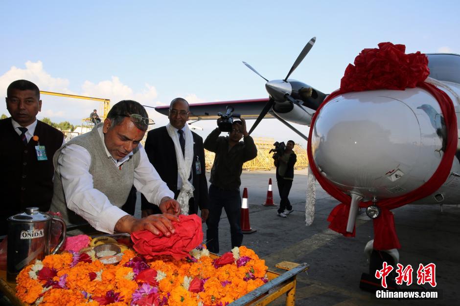 11月3日,尼泊尔首都加德满都特里布万机场人头攒动,当地民众以一阵阵掌声迎接中国交付的首架运12E飞机。这是尼泊尔航空公司28年来迎来的第二架新飞机,第一架则为今年4月中国交付的新舟60客机。运12系列飞机由中航工业哈尔滨飞机工业集团生产,已获得美国等发达国家的相关技术“通行证”,适合执飞中短程航班。图为尼泊尔航空公司以特有的传统礼仪庆祝新飞机的到来。中新社发 符永康 摄