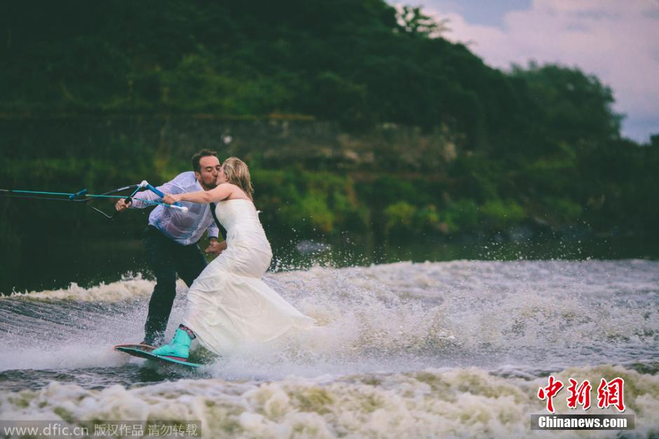当地时间2014年11月4日报道,来自北爱尔兰科尔雷恩的一对新人30岁的Peter Stewart和27岁的 Fiona Bannon决定边玩水上滑板,边拍婚纱照。Peter花了一个夏天在巴恩河畔教Fiona玩水上滑板,所以他们决定用这个独特的方式记录他们的爱情历程。