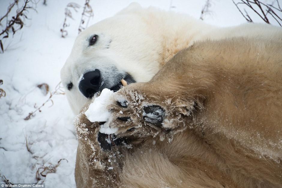来自美国加利福尼亚州的29岁摄影师比尔·德拉姆开车经过加拿大马尼托巴省的丘吉尔城时,偶遇一头北极熊。当它向车靠近时,德拉姆迅速将相机举到车窗外,在这头北极熊研究他的摄像头时,他幸运地抓拍到了这个庞然大物呆萌的一面。当时北极熊的鼻子距离镜头仅仅几英尺。