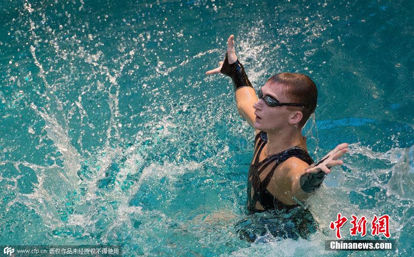 当地时间2014年11月2日,俄罗斯莫斯科,俄罗斯唯一一名男性花样游泳运动员Alexander Maltsev在表演中。