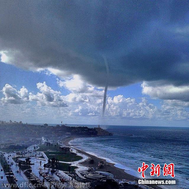 当地时间2014年11月3日,以色列特拉维夫,当地居民亲眼目睹了壮观的景象,一场龙卷风抵达陆地前在海上形成的旋风的全过程。