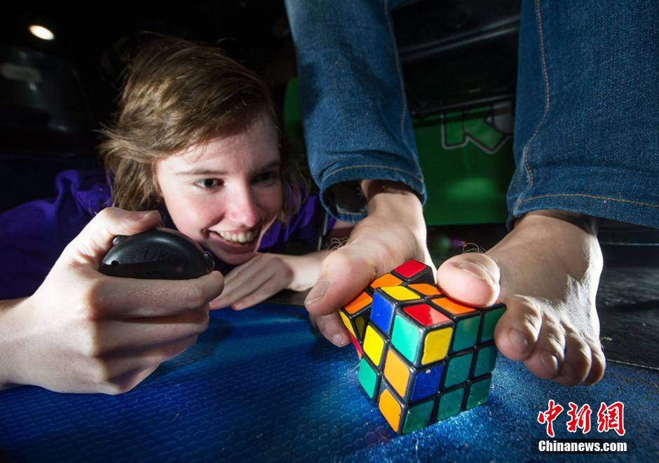 当地时间2014年11月2日,英国莱斯特,英国国家魔方锦标赛在英国莱斯特举行,在其中的一个竞赛单元中,选手被要求只能用脚来进行比赛。最后,一名选手仅用时1分3秒夺冠。