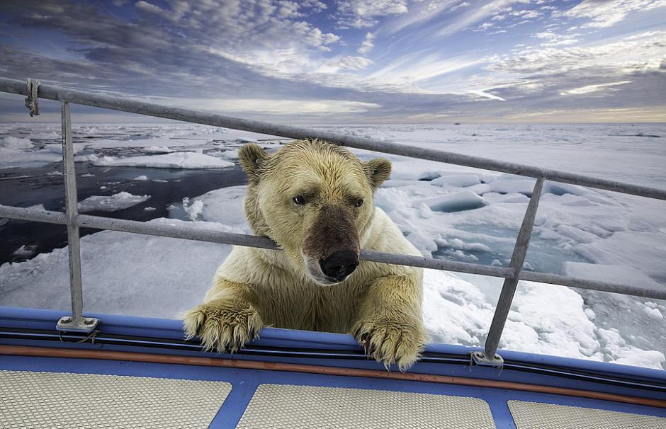 摄影师拍到北极熊分食海象 满身血迹欲登船