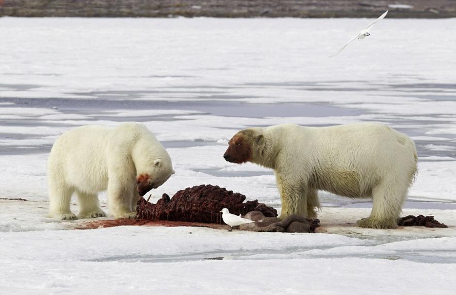 据英国《每日邮报》报道,当地时间11月3日,一名瑞士摄影师Franco Banfi在行船驶往挪威的斯瓦尔巴特群岛时,拍到了令人震惊的一幕,三名成年北极熊正在分食一头海象的尸体。与之前看到的北极熊萌态可掬不同,图中的这些大型捕猎者满嘴是血,身上也溅满了红色的血迹,令人胆战心惊。其中一只更是大胆的想要登上摄影师的船。(网页截图)