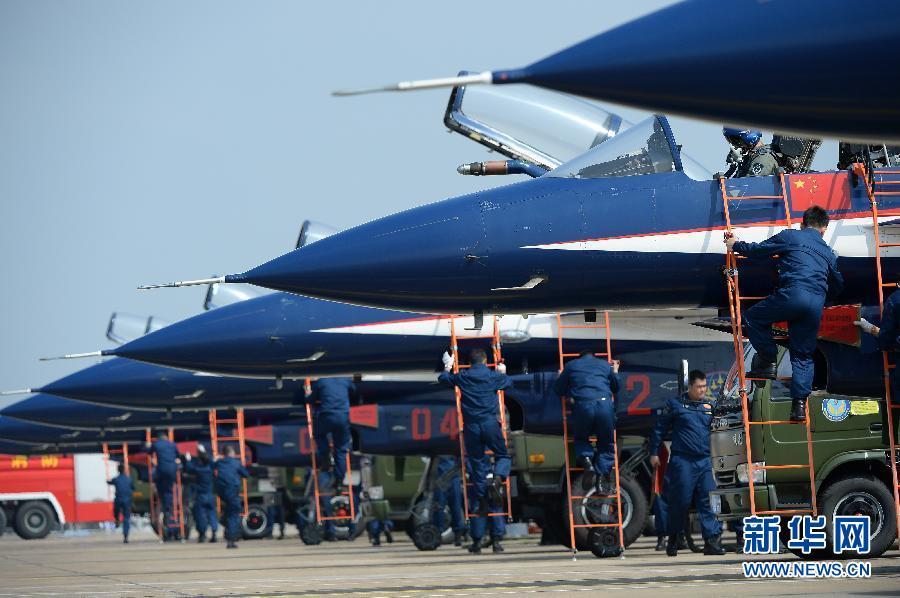 11月9日,中国空军八一飞行表演队在珠海机场进行试飞训练。第十届中国国际航空航天博览会(简称“中国航展”)将于11月11日至16日在珠海举行,中国空军八一飞行表演队的8架歼-10飞机将在开幕当天进行表演。沈玲 摄 图片来源:新华网