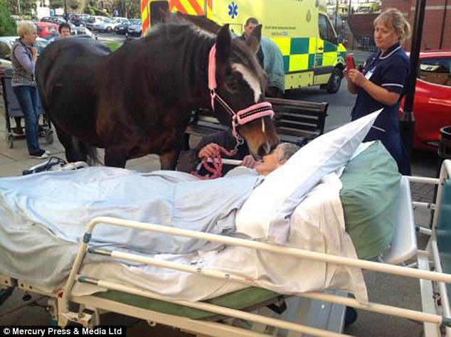 据英国《每日邮报》11月9日报道, 英国一名叫马什的老妪临终之际,想要再看一眼那一匹她养育了25年的马儿。最终,在医院安排下,这匹马儿去医院与主人告别,留下感人一幕。马什躺在病床上,马儿用鼻子温柔地碰触着她。而就在几小时后,马什离世。(网页截图)