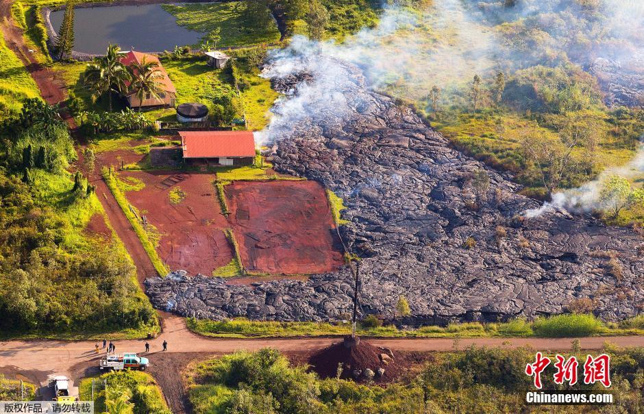 当地时间2014年11月10日,美国夏威夷,基拉韦厄火山喷发出的岩浆流向附近居民区和农田,吞噬了帕霍瓦镇上的民居。