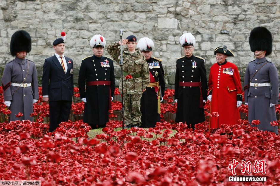 当地时间2014年11月10日,英国伦敦,伦敦塔周边“种植”了888246朵陶瓷材质的罂粟花,以此纪念在一战中阵亡的士兵。每年的11月11日是英联邦国家的阵亡将士纪念日,今年又恰逢一战爆发100周年,红色陶瓷罂粟花海就是英国悼念活动的一部分。