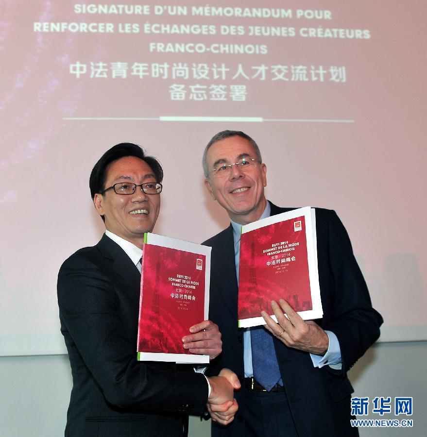 11月13日,在法国巴黎,中国(杭州)纺织服装工业设计创意中心总裁郑念华(左)与法国时尚学院院长多米尼克·雅科梅签署《中法青年时尚设计人才交流计划》。当日,由中国服装协会等举办的2014中法时尚峰会在巴黎举行。峰会旨在中法双方共同谋划并开启未来50年的合作之路,促进双方时尚界有识之士加深互信、增进了解,寻找深化互利合作的新思路和新机遇。新华社记者陈晓伟摄