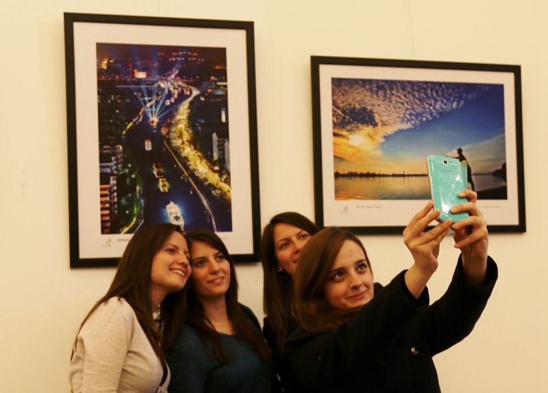 图为图片展上,梅尔薇和朋友们在欢乐地自拍。