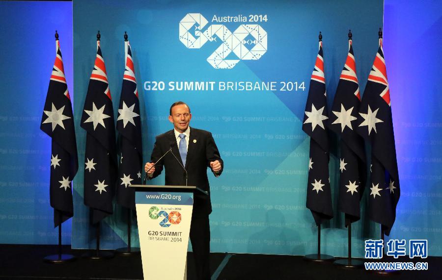 11月16日, 澳大利亚总理阿博特在布里斯班出席G20峰会记者会。 新华社记者 赵丹惠 摄
