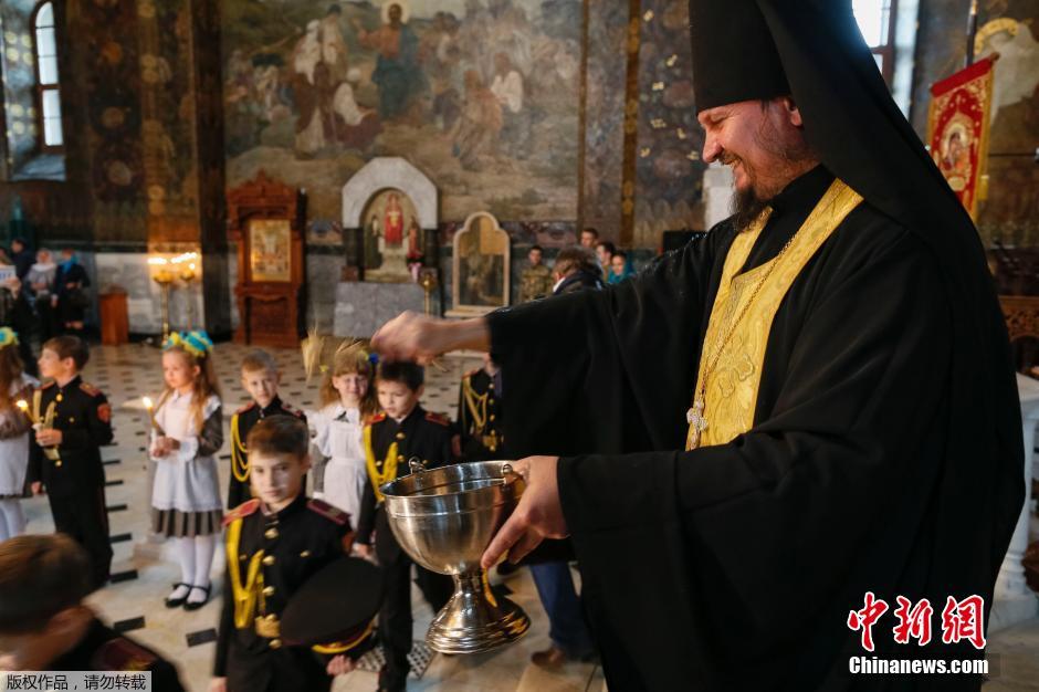 当地时间2014年11月14日,乌克兰首都基辅,近100名童子军在基辅Pechersk Lavra修道院参加宣誓仪式。