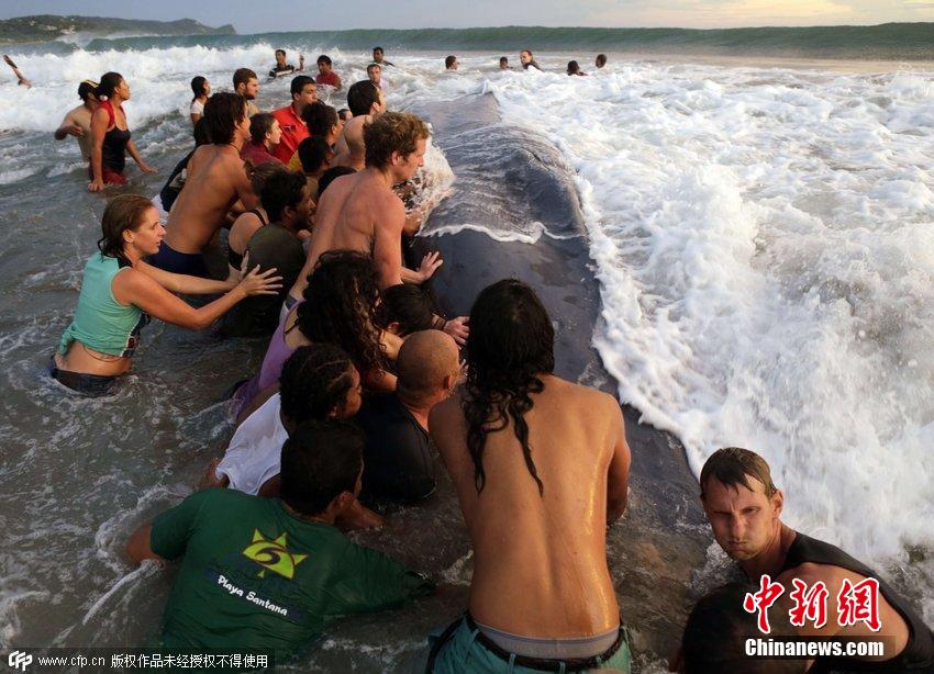 当地时间2014年11月14日,尼加拉瓜里瓦斯,人们在Popoyo海滩帮助一只搁浅的鲸鱼脱困。
