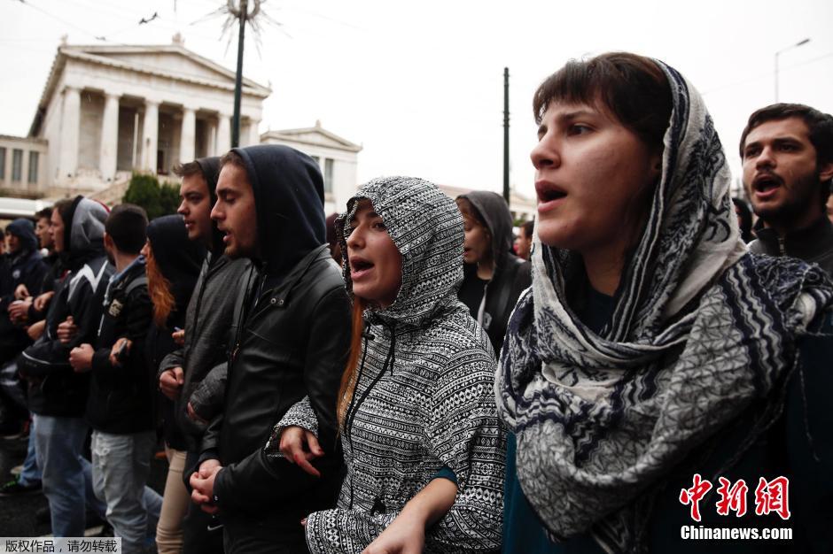 希腊学生筑人墙游行 纪念学生反抗军政府起义29周年