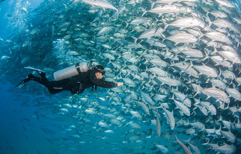 澳夫妇潜水遇鱼群“包围” 镜头记录震撼景象