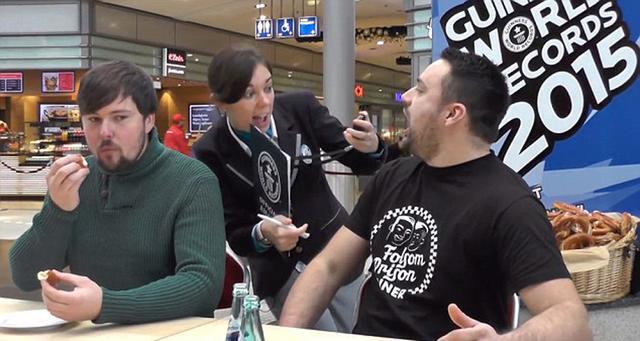 据英国《每日邮报》11月14日报道,为了庆祝13日的吉尼斯纪录日,2名德国男子尝试创造新的世界纪录。他们挑战不喝水最快吃椒盐卷饼纪录,最快速度为1分42秒吃掉一个。(网页截图)