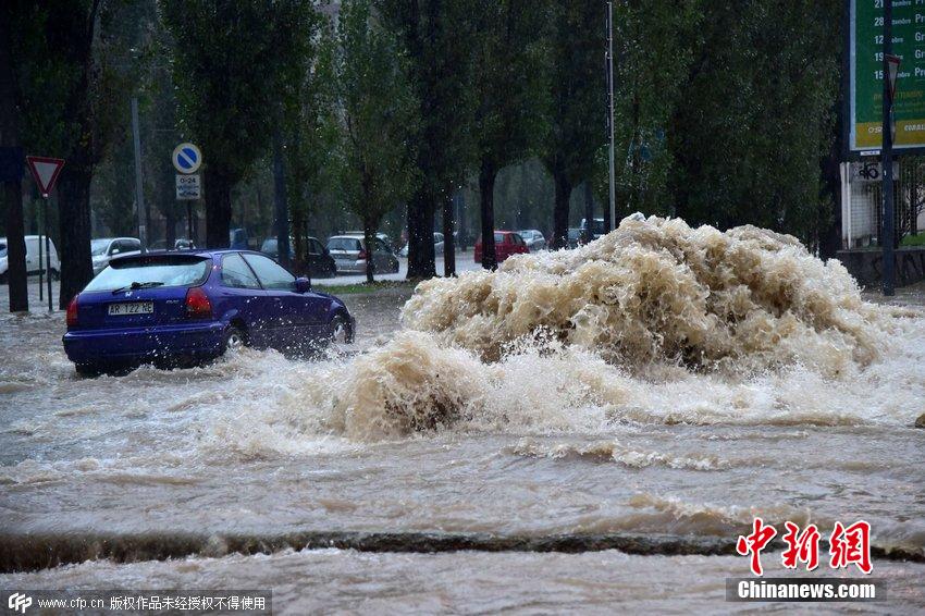 当地时间2014年11月15日,意大利米兰,暴雨引发洪水淹没街道,民众出行困难。