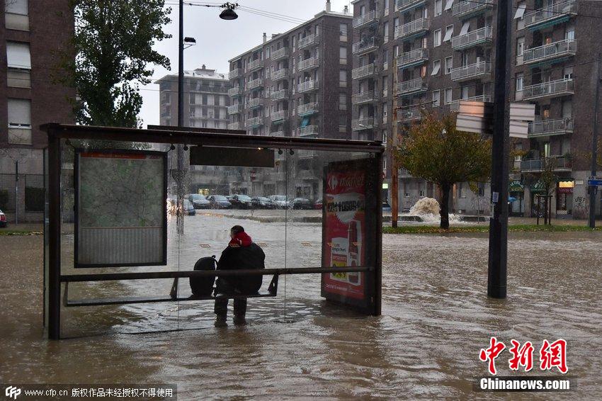 当地时间2014年11月15日,意大利米兰,暴雨引发洪水淹没街道,民众出行困难。