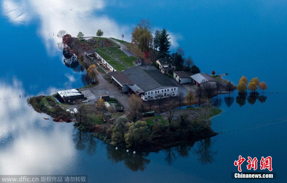 当地时间2014年11月16日,瑞士南部提契诺州降雨不断,造成卢加诺湖数处决堤,该地区主要交通干道已经封闭,部分地方的居民被紧急疏散。一农场遭洪水围困成“孤岛”。